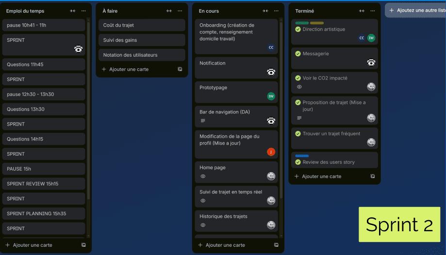 Les tâches ont été organisées sur Trello, un outil qui nous a permis de structurer efficacement le travail et de répartir les responsabilités au sein de l’équipe. Sur ce tableau, chaque tâche était classée en fonction de son état d’avancement — À faire, En cours, Terminé — afin de garantir une visibilité claire et partagée par tous.