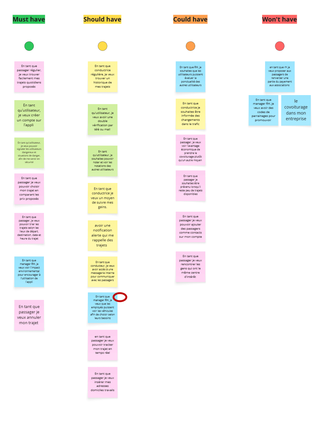 L’étape suivante consiste naturellement à organiser et hiérarchiser l’ensemble des fonctionnalités issues de nos User Stories. Pour cela, nous avons utilisé la méthode MoSCoW, un outil de priorisation largement employé en gestion de projet agile.